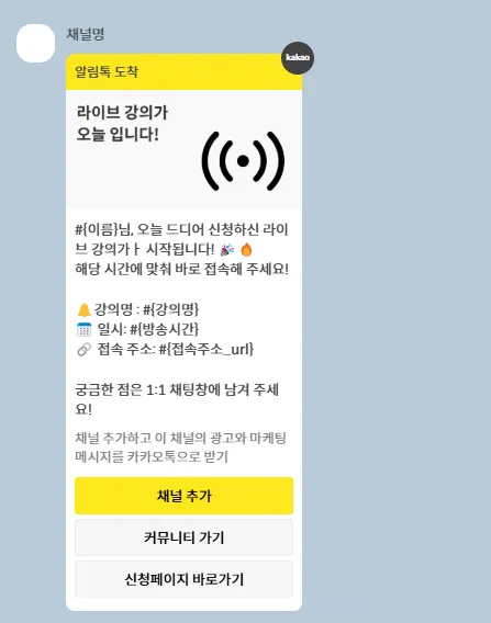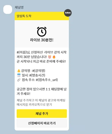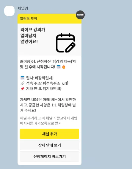 알림톡 2 : 라이브 강의 O일전 리마인드(커뮤니티 없음, 채팅유도)