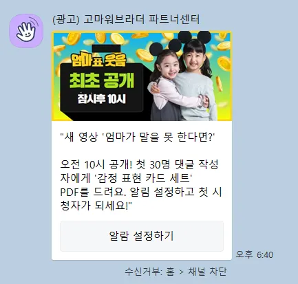 10일차: "새 영상 '엄마가 말을 못 한다면?' 내일 오전 10시 공개! 첫 30명 댓글 작성자에게 '감정 표현 카드 세트' PDF를 드려요. 알림 설정하고 첫 시청자가 되세요!"