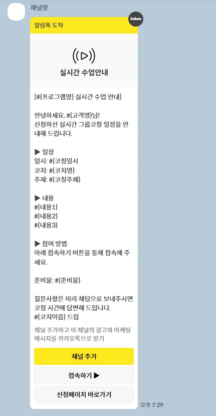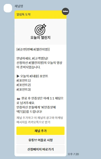 친구톡 (채널 친구 추가시): "채널 친구가 되어주셔서 감사합니다! 회원 전용 '효율적인 운동을 위한 15가지 팁' PDF와 주간 그룹 코칭 일정을 보내드립니다. 채널 친구에게만 제공되는 '식후 5분 대사 활성화 운동' 영상도 확인해보세요!"