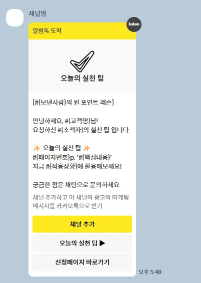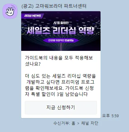 친구톡 (채널 친구 추가시): "채널 친구가 되어주셔서 감사합니다! 가이드북에는 없는 비밀 자료 '톱 1% 영업 리더의 아침 루틴'과 '세일즈 리더 자가진단 테스트'를 보내드립니다. 진단 결과를 공유하시면 맞춤형 조언을 드려요!"