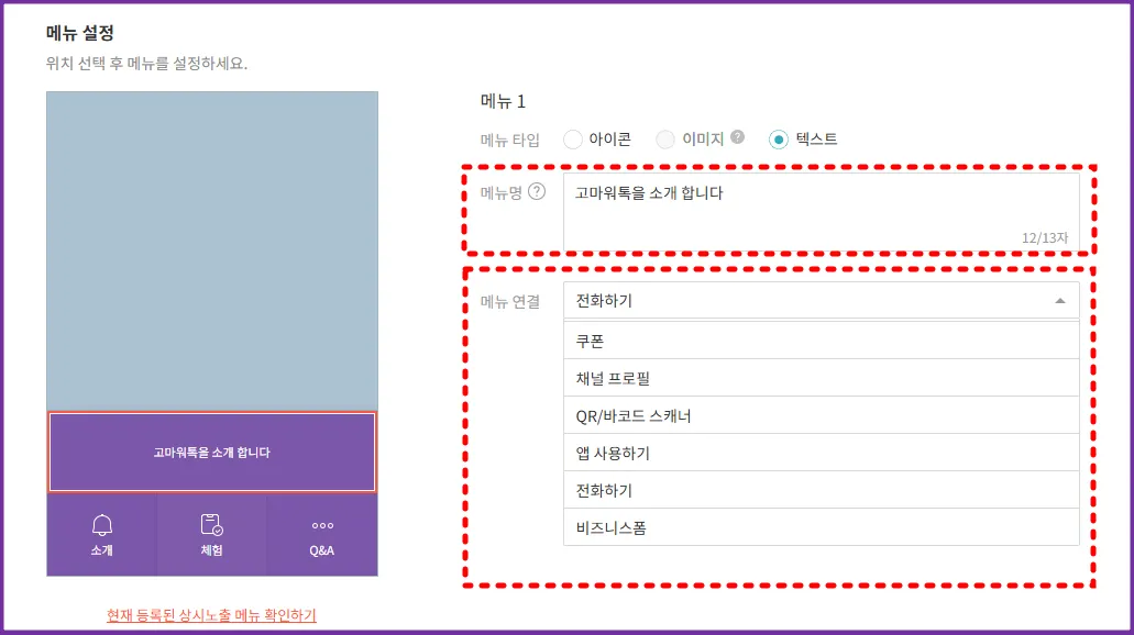 ➔ 메뉴명과 메뉴 연결을 선택 합니다.