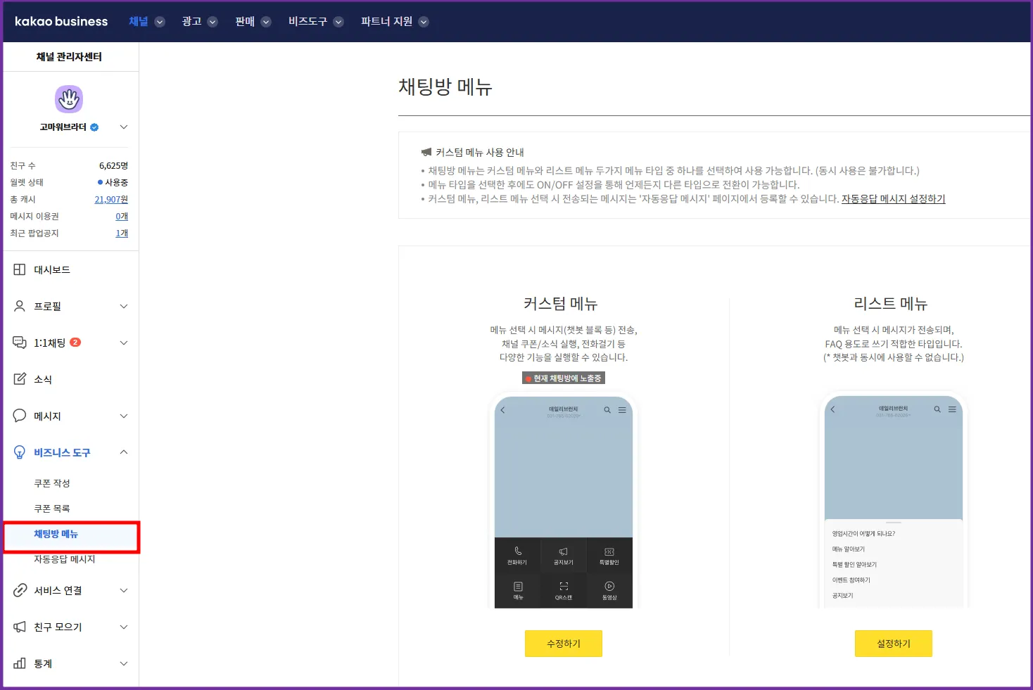 카카오톡 채널 관리자센터 ➔ 비즈니스 도구 ➔ 채팅방 메뉴 설정 으로 이동합니다.
