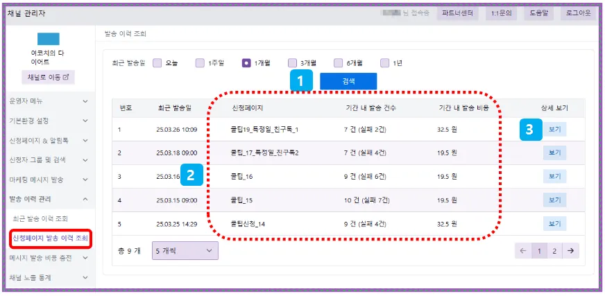 1. [신청페이지 발송이력 조회] 화면