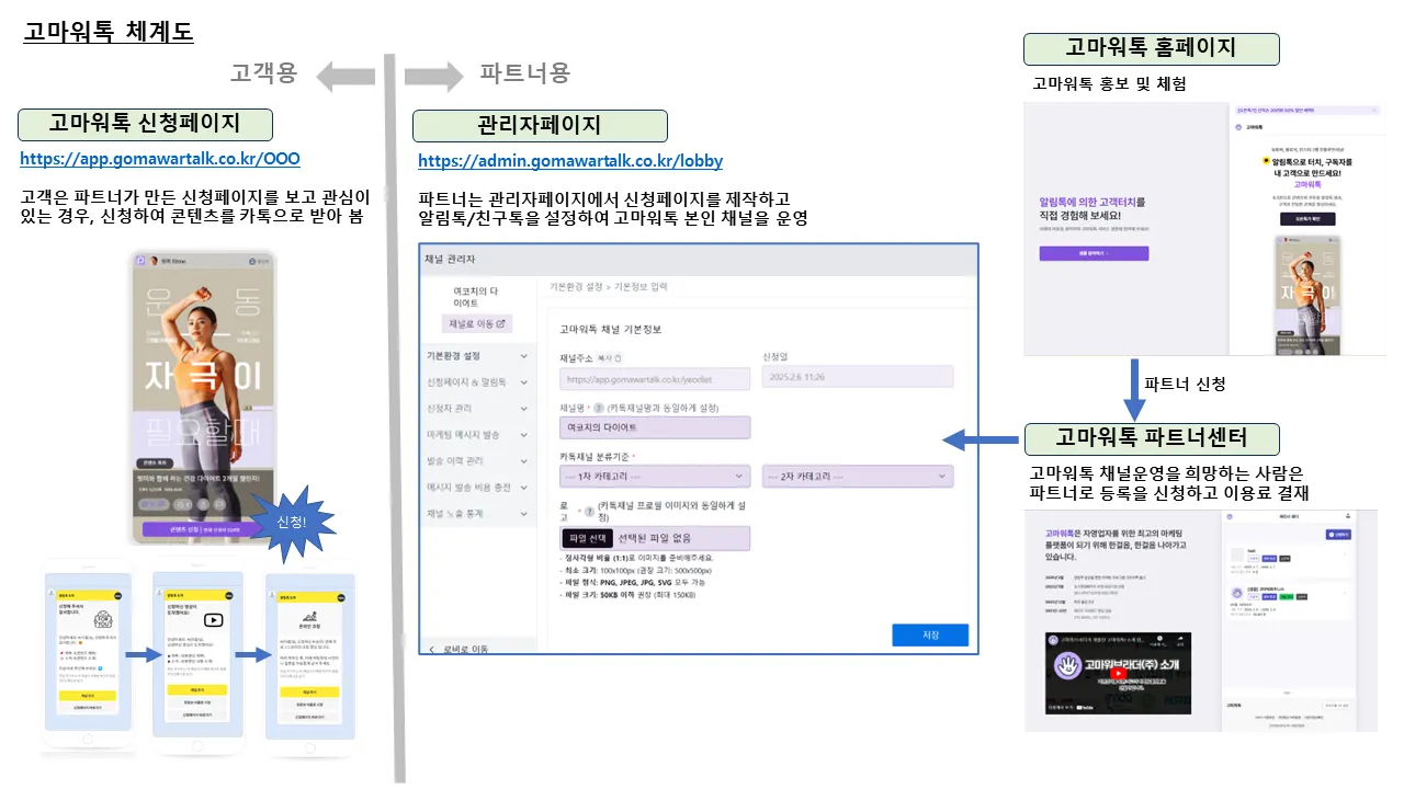 고마워톡 서비스의 주요 4개 웹페이지(관리자페이지, 신청페이지, 홈페이지, 파트너센터)의 역할과 흐름을 이해하고, 직접 운영할 수 있습니다.