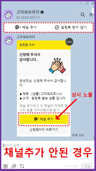친구가 아닌 경우: 알림톡에 '+채널 추가' 버튼이 항상 보입니다.