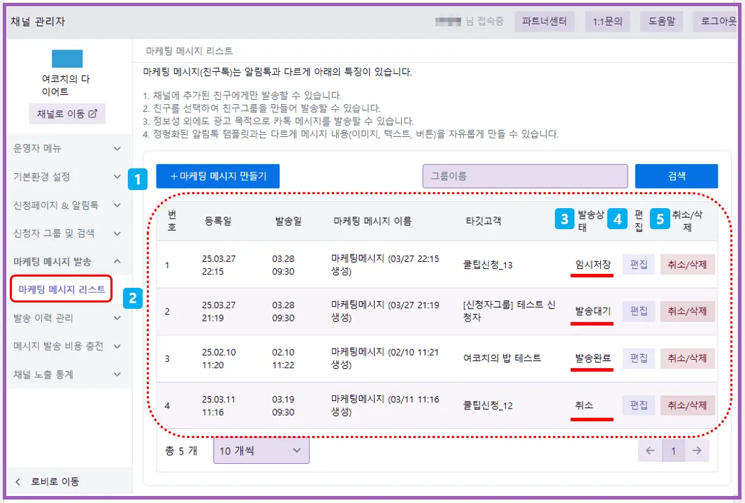 발송완료 : 마케팅 메시지 발송을 완료한 상태로 편집 및 취소/삭제가 불가합니다