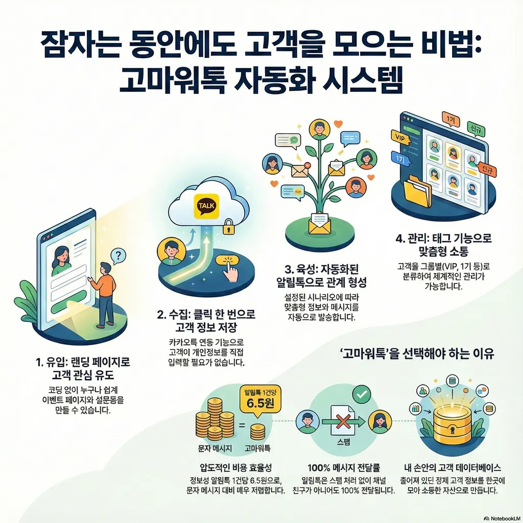랜딩 페이지로 고객 관심을 유도하고, 클릭 한 번으로 고객 정보를 자동 수집합니다. 수집된 정보는 자동으로 분류되어 맞춤형 메시지로 전송되며, 태그 기능으로 고객을 체계적으로 관리할 수 있습니다.