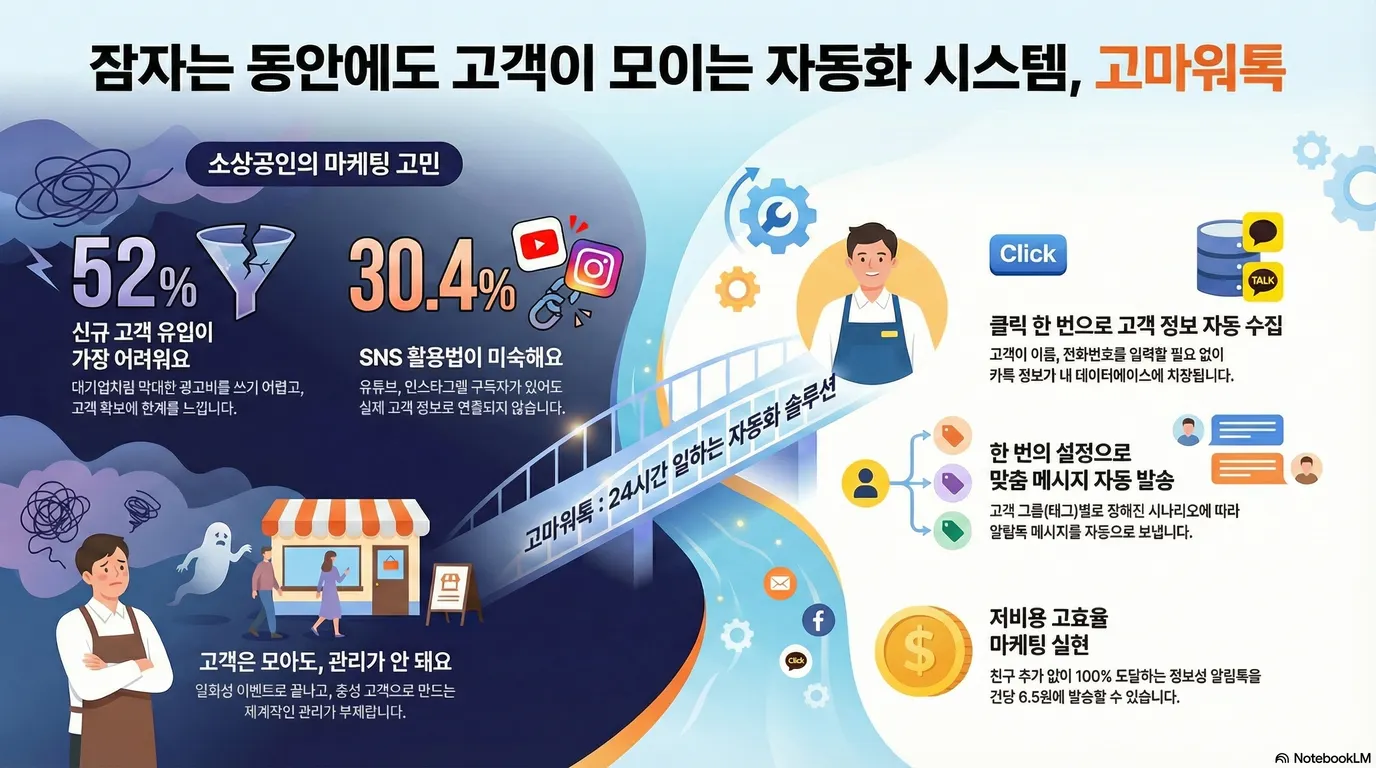 신규 고객 유입이 가장 어렵다고요? 52%의 소상공인이 같은 고민입니다. SNS 마케팅도 어렵고, 24시간 고객 관리도 부담스럽다면 고마워톡이 답입니다.