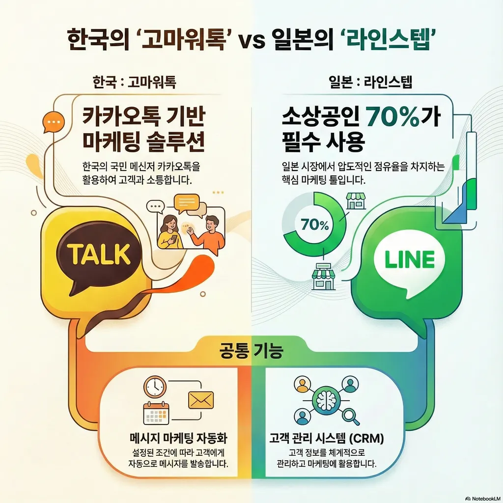 일본의 라인스텝은 소상공인 70%가 이미 사용하고 있는 검증된 마케팅 툴입니다. 고마워톡은 한국 시장에 맞춘 같은 수준의 자동화 솔루션으로, 고객 관리와 메시지 마케팅을 한 곳에서 해결할 수 있습니다.
