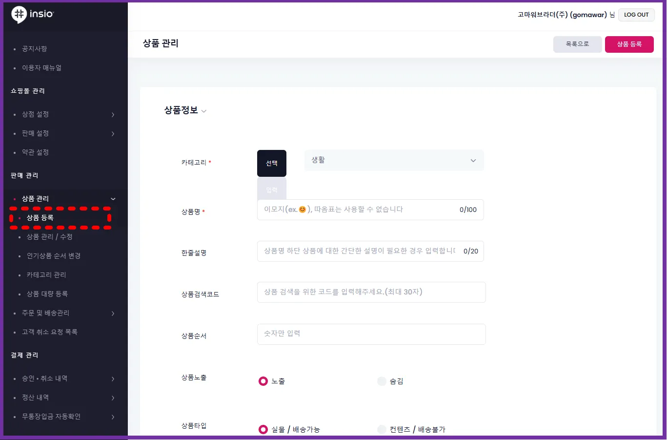 이 매뉴얼은 Insio 쇼핑몰에 상품을 등록하여 판매하는 방법을 안내합니다.